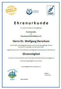 20. Mai 2022: Im Rahmen der Mitgliederversammlung wurde der Vorstand neu gewählt. Dr. Wolfgang Derschum gab den Vorsitz in die Hände von Julia Schmenk, die nunmehr mit Stefan Pohl als 2. Vorsitzenden das Steuerrad übernahm. Zugleich wurde Dr. Wolfgang Derschum zum Ehrenvorsitzenden ernannt. Er ist damit überhaupt erst der zweite Ehrenvorsitzende in der Geschichte des Tauchsportclub Koblenz e. V. Zugleich verabschiedete sich Volker aus der Mitarbeit im Vorstand, in dem er als Trainer C die Ausbildungsfachlichkeit fast annähernd so lange wie Wolfgang Derschum repräsentierte.